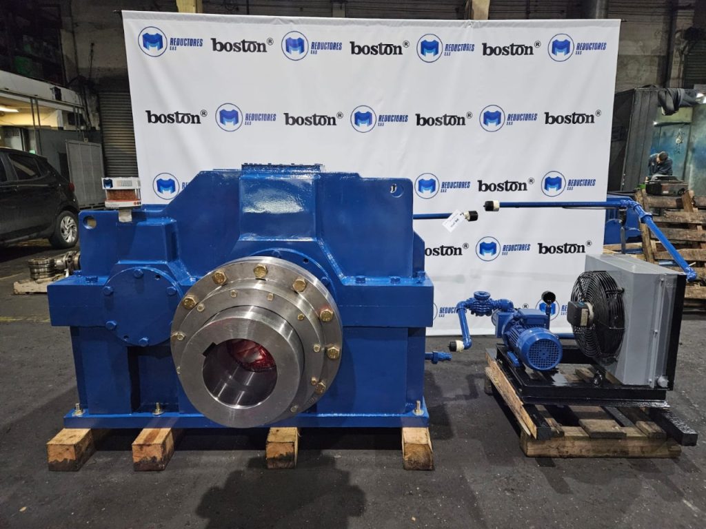Fabricación de reductor helicoidal apto para 2000 HP a 1450 RPM, con sistema de lubricación y refrigeración forzada mediante intercambiador de calor.